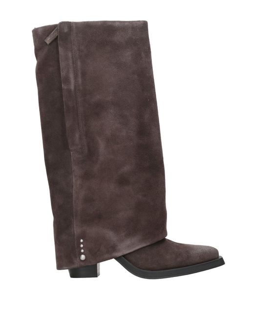 - Suede Leather - Tex Style - Turn-up on the cuff - Decorated on the outside bottom - Zipper closure on top of outer lateral - Pointed toe model with square finial - Leather insole - Rubber sole - Multi-layered heel - Height 8.5cm Colour: brown