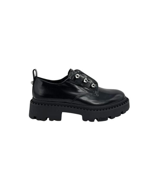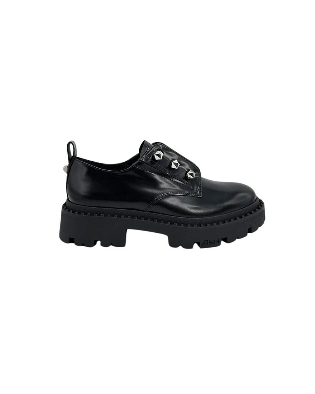 Elevate your style with these ASH lace-up boots for women. Crafted from black leather, these mocassin-style shoes feature a round toe and metallic logo appliques on the vamp. The chunky rubber sole adds a touch of edginess to your look. Colour: black