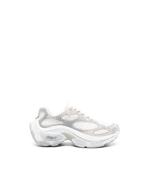 ASH Dragon 06 is a panelled trainer that pairs leather and mesh construction with a sculptural rubber sole and white cutout detailing for elevated everyday wear. Key attributes: White | Grey | Leather | Breathable mesh panels | Lace-up closure | Rubber outsole | Panelled upper | White cutout detail | Sculptural rubber sole | Dimensions & fit: Regular fit | Composition & care: Leather | Mesh | Microfiber | Fabric lining | Rubber sole | Wipe clean with a damp cloth. Do not machine wash. Colour: white