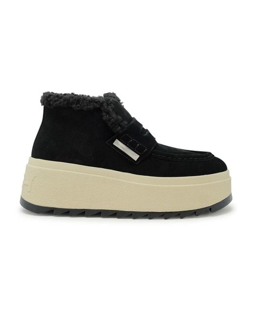ASH Magic 02 Ankle Boots combine a calf-suede upper with a faux-shearling lining and a gripped flatform sole for warm, winter-ready style and everyday comfort. Key attributes: Black | Calf suede | Faux-shearling insulated lining | Gripped rubber outsole | Slip-on / pull-on design | Platform sole | Ankle-height silhouette | Chunky flatform sole | Composition & care: Calf suede | Synthetic/faux shearling lining | Fabric lining | Rubber outsole Colour: black