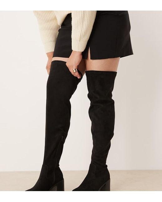 Shoes by ASOS DESIGN Over-the-knee style Zip-side fastening Square toe Platform sole Mid block heel. Colour: black