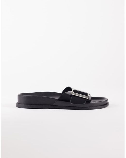Shoes by ASOS DESIGN Wide strap Silver-tone pin buckle Open toe Moulded footbed Flat sole Colour: white