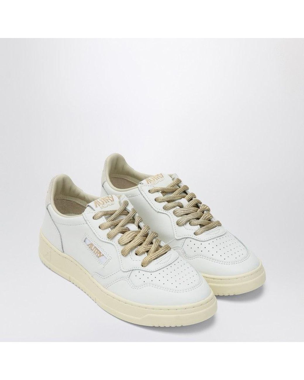 Autry low-top sneaker in white leather, characterized by logo detail on the sides, perforated toe, front closure with gold laces, leather tongue with stitched label in tone, padded collar, heel tab on the back with logo, leather and cotton sponge lining, and cream rubber sole.SpecificationValueBrandAUTRYAge GroupadultColorWhiteMaterialLeatherMade InIndiaGenderWomenSize36 ITSeason["SS26", "Carryover"]