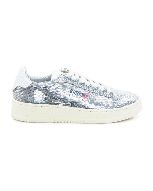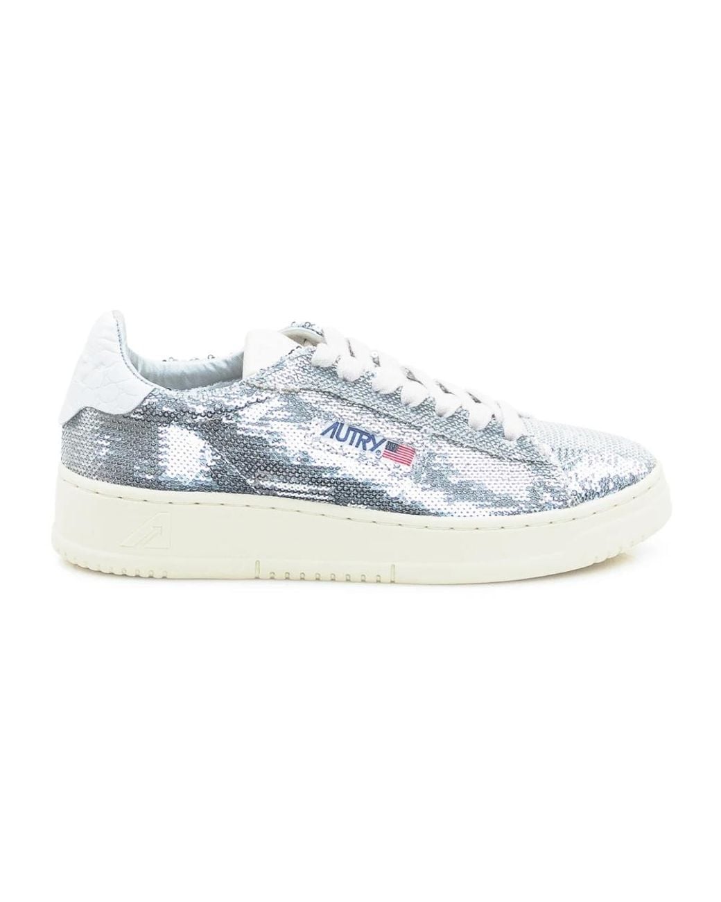 Autry’s Medalist Low updates the brand’s classic tennis silhouette with a low-top profile in silver sequin fabric and white accents, finished with the signature side logo for a polished everyday trainer. Key attributes: Silver | White | Sequin fabric | Rubber sole | Lace-up fastening | Padded collar | Low-top silhouette | Side logo | White detailing | Sequin upper | Dimensions & fit: Sole height: 2.5–3.5 cm | Fits true to size | Regular fit Colour: blue