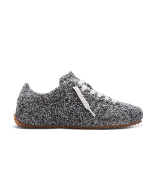 The Tact Runner’s low-profile silhouette is distinctly bold – blending a minimalist design approach with experimental materials. Trimmed with leather, it’s handcrafted in Portugal from Italian suede that’s brushed for a uniquely fluffy texture. Handdrawn chain-stitch embroidery subtly details the tongue, while the rubber sole is uniquely molded to resemble knitwear. This pair comes with a second set of tonal laces.