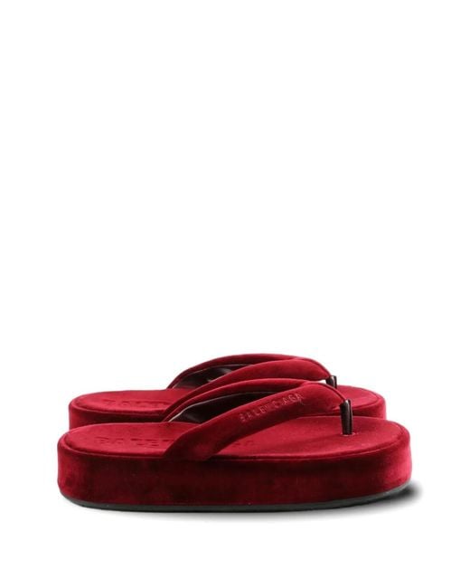 Burgundy red velvet finish platform sole thong strap embroidered logo to the side logo-engraved footbed Size: 36. Gender: Female. Material:Cotton/Viscose/Spandex/Elastane/Cotton/Viscose/Elastane/Thermoplastic Polyurethane (TPU). Colour: red