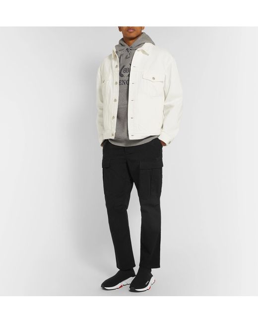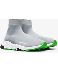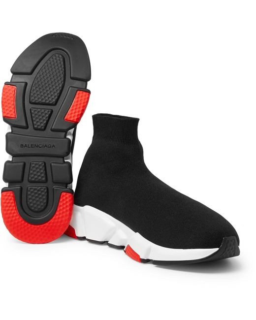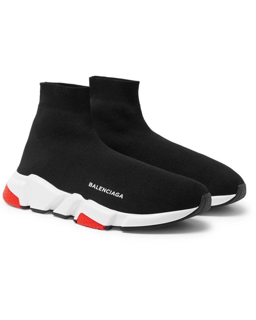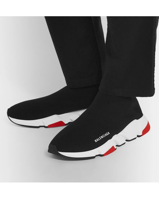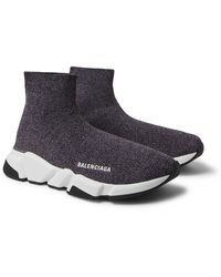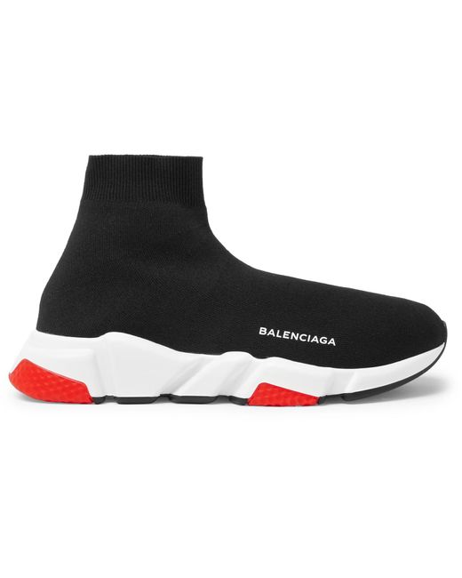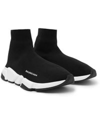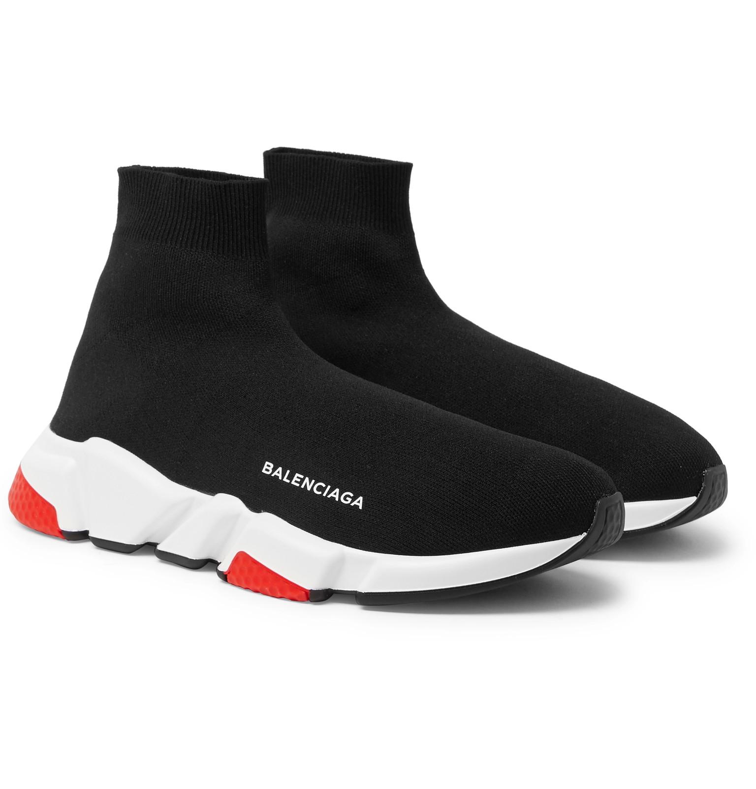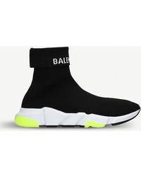 Balenciaga 's 'Speed Sock' trainers debuted back in 2016 and are still dominating the streets – once you slip a pair on you'll realise it's for reasons other than their of-the-moment knitted construction. The flexible uppers are incredibly comfortable and built to adapt to the changing shape of your feet, while the thick rubber soles provide traction and support. Shown here with Balenciaga trousers, Balenciaga hoodie, Balenciaga jacket. Black stretch-knit. Designer emblems, rubber soles. Made in Italy. For Men. Colour: black