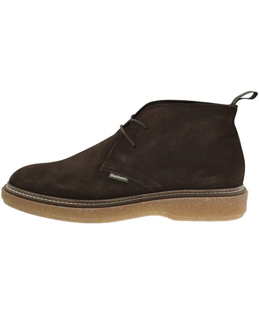 Barbour Blaine Boots In Choc Suede. Suede uppers with a lace fastening and a slim tongue. A Barbour pull tab on the ankle with a branded pinch tag on the outstep. A rand with beige stitching detail. Textrued chunky midsole and a branded undersole. Colour: brown
