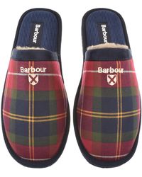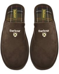 Go to MainlineBarbour Everitt Mule Slippers In Camel Brown. A pair of slip on slippers in a suede design. A camel brown woven trim is situated around the slippers with a soft fleece interior. The