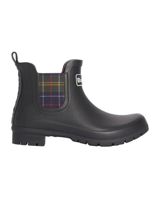 Barbour Kingham Wellingtons are Chelsea boot–inspired waterproof rubber boots designed for wet-weather wear. They combine a tartan elastic gusset and practical rubber construction for country walks or everyday rainy days. Key attributes: Black | Rubber | Waterproof | Elastic side gussets for easy on/off | Rear pull tab | Durable rubber outsole | Chelsea boot–inspired silhouette | Tartan-pattern elastic gusset | Barbour-embossed heel tab | Dimensions & fit: Boot height: 11.5 cm | Heel height: 3 cm | Composition & care: Upper: 55% Rubber, 45% Other fibres | Lining: 100% Polyester | Sole: Rubber | Remove dirt after wear with a soft brush or cloth. Sponge clean with water or a specialist rubber boot cleaner. Do not dry near a heat source or in direct sunlight; allow to dry in a well-ventilated area. Colour: black