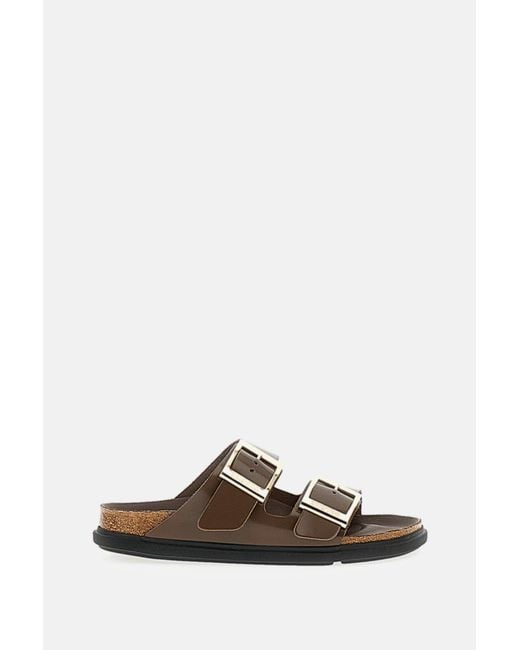 Iconic two-strap sandal model Two adjustable straps with large metal buckles Anatomical cork and latex insole Natural patent leather upper Padded leather footbed EVA sole Color: brownComposition: 100% Leather