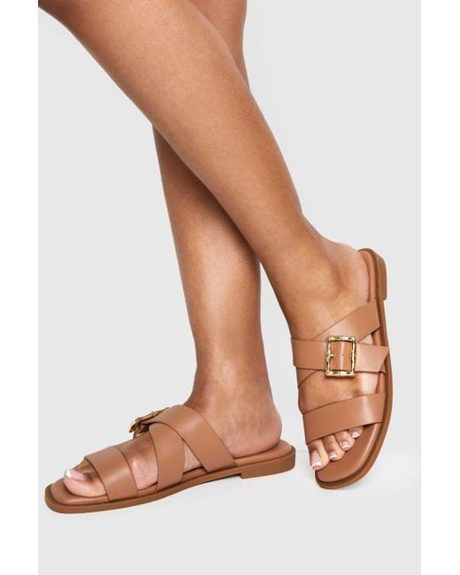 Stylish cross-strap design with elegant gold-tone buckle detail Flat heel (under 2cm) for all-day comfort and wearability Slip-on style for effortless wear and convenience Versatile open-toe silhouette perfect for warmer weather Smooth finish with clean lines for a contemporary look These chic cross-strap sandals from Boohoo combine contemporary style with everyday comfort. The distinctive strap arrangement creates visual interest whilst the gold-tone buckle adds a touch of sophistication to this casual footwear essential. Pair them with cropped jeans and a crisp white tee for weekend brunches, or style with a flowing midi dress for garden parties and summer gatherings. The flat design ensures you can navigate cobbled streets or grassy lawns with ease, whilst the neutral tone makes these sandals incredibly versatile for your warm-weather wardrobe. Perfect for city breaks when you need something that transitions seamlessly from daytime sightseeing to casual evening meals. These sandals offer the ideal balance of fashion and function - a summer staple that will complement countless outfits throughout the season. Colour: natural