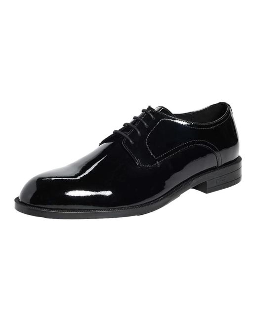 Elevate your formal ensemble with these sophisticated black derby shoes from Hugo Boss. Crafted for style and comfort, they feature a sleek patent finish and a classic lace-up design. Key attributes: Black | 100% Calf Leather | Padded insole | Lace-up closure | Patent finish | Refined branded details | Dimensions fit: Regular fit | Composition care: 100% Calf Leather | Clean with a soft cloth Colour: black