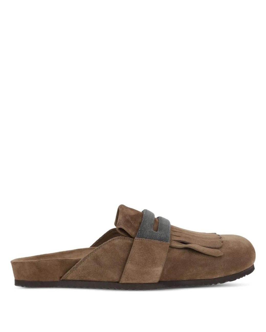 Chestnut brown slip-on style open back round toe flat rubber sole Size: 41. Gender: Female. Material:Suede.