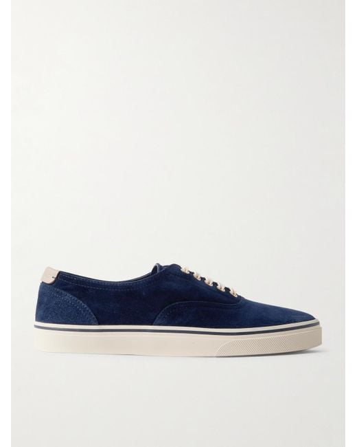 Brunello Cucinelli's sneakers recall retro tennis shoes. Easy to style with any smart or casual outfit, they've been made in Italy from navy suede and have leather heel tabs debossed with the founding date of Solomeo in Roman numerals.