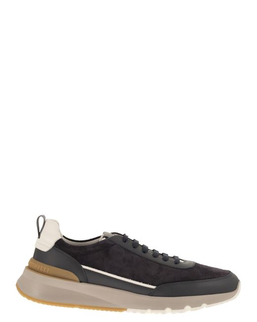 Brunello Cucinelli's fine materials elevate the active style of these new runners. The velvety, slightly irregular appearance of the washed suede is paired with semi-gloss calfskin leather trim, enriching the shoe with a refined contrast of textures. The subtle grooves visible on the back of the two-tone micro sole and on the TPU insert at the base of the heel complete the style of the shoe. The fine washed suede is brushed by hand, enriching the velvety texture with a slightly irregular colour effect. The leather lining completes the shoe. - Flat fabric laces - Leather lining - Removable insole - Lightweight micro sole DESIGNER ID: MZUSGGO278 CYD22SpecificationValueYear2025SeasonFALL / WINTERMaterialsUpper: Washed suede and Semi-gloss calfskin Lining: Leather Sole: Micro lightweightColorNIGHT BLUEColor CodeCYD22Made InItalyMeasuresSole height: 4 cmGenderMenSize FormatIT Colour: multicolour