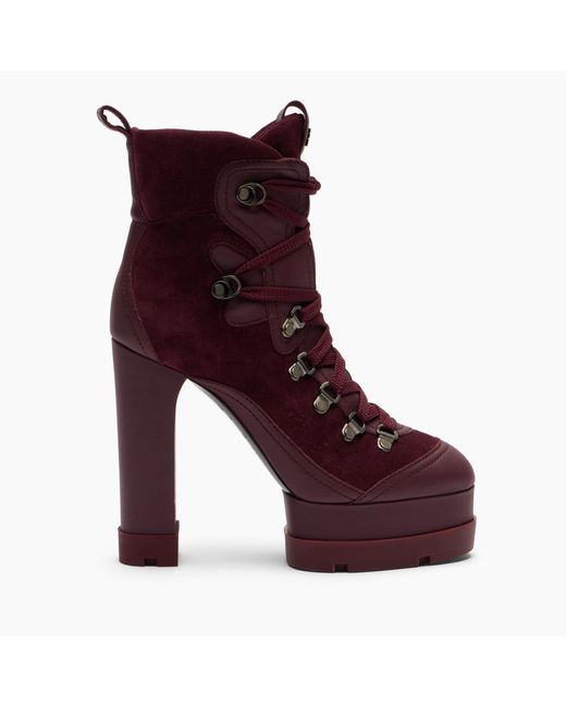 The Nancy platform ankle boot in ruby-coloured suede and smooth ton-sur-ton leather inserts is presented as a metropolitan ankle boot on a rubber tank bottom. The vertiginous chunky heel is balanced by a sturdy platform to guarantee stability and practicality. The lace-up fastening detail with small metal hooks makes this model perfect for tackling winter with style and character. Colour: purple