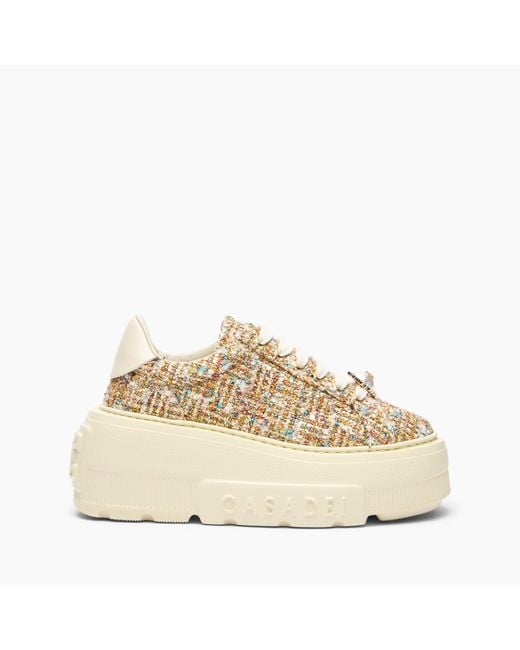 Casadei's Bouclè sabot trainer is a must-have for your wardrobe. A creation with a techno-futuristic sole, made of fabric and natural-coloured leather inserts and featuring an ultra-light wedge with a modern design, making it a must-have for the season. The iconic C-Chain detail, embellished with a jewelled pearl, together with the maxi logo on the side, gives the Maison's flagship trainer a strong and instantly recognisable identity. Ideal for casual-chic looks, dynamic days, and travels where comfort and style make all the difference. Colour: natural