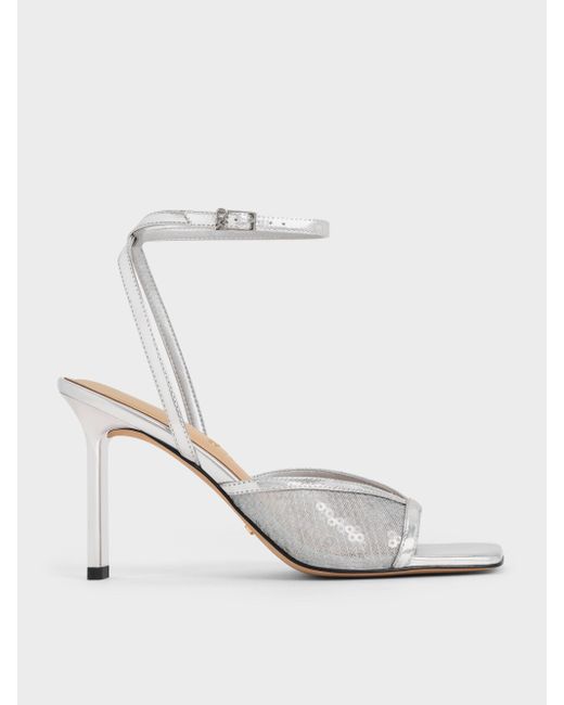- Sequin Mesh & Leather Ankle-Strap Heeled Sandals