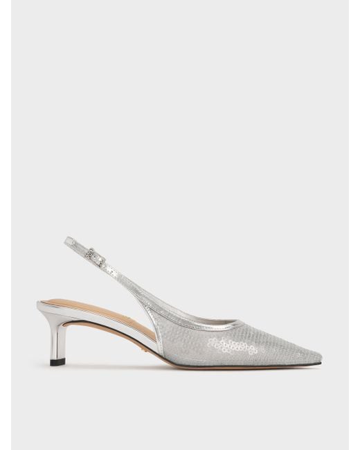 - Sequin Mesh & Leather Slingback Kitten Heels