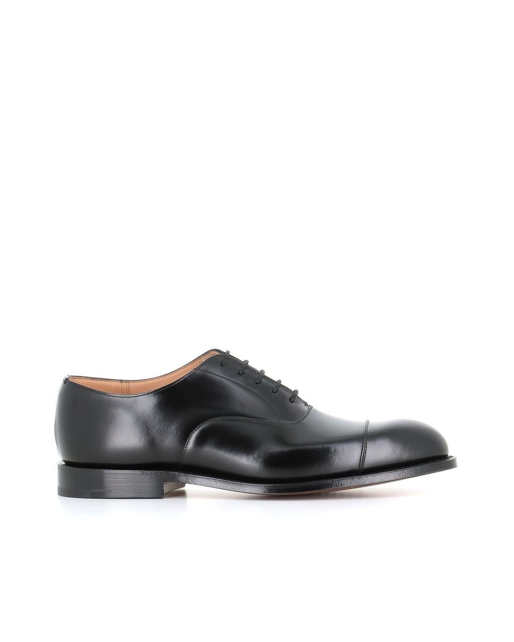 Black brushed leather man's Oxford shoes by Church's, feauturing by toe seams. Lined interior. Goodyear construction. Fit: G Heel: 2 cm. Composition: Leather