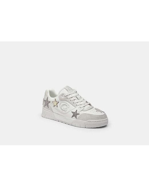 Our Coach Soho Trainer is inspired by the courageous free spirit of our hometown New York City and built to keep pace with life on the go. Crafted of smooth leather and suede purposely distressed for a lived-in look and detailed with a scattering of star patches for a playful embellishment it features a lining made with 100% recycled polyester and a midsole that contains at least 28% bio-based content created through a process that uses renewable sources in place of fossil-based. The comfortable style is finished with a grooved rubber outsole detailed with a map of Manhattan. | Women's Soho Trainer With Stars, Size 10 Colour: black