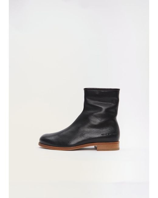 Common Projects black boot. With a round spit toe and silver-toned side zipper closure in soft nappa leather. Features. A leather sole and stacked heel. Fully lined in brown nappa leather. Finished with signature article stamp at side. Sizing: European (36-41). Upper: Nappa Leather. Made in Italy. Colour: black