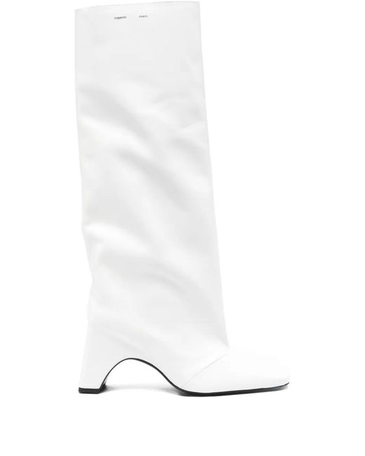 White leather upper square toe block heel knee-high pull-on style Size: 37. Gender: Female. Material:Calf Leather/Calf Leather/Calf Leather. Colour: white
