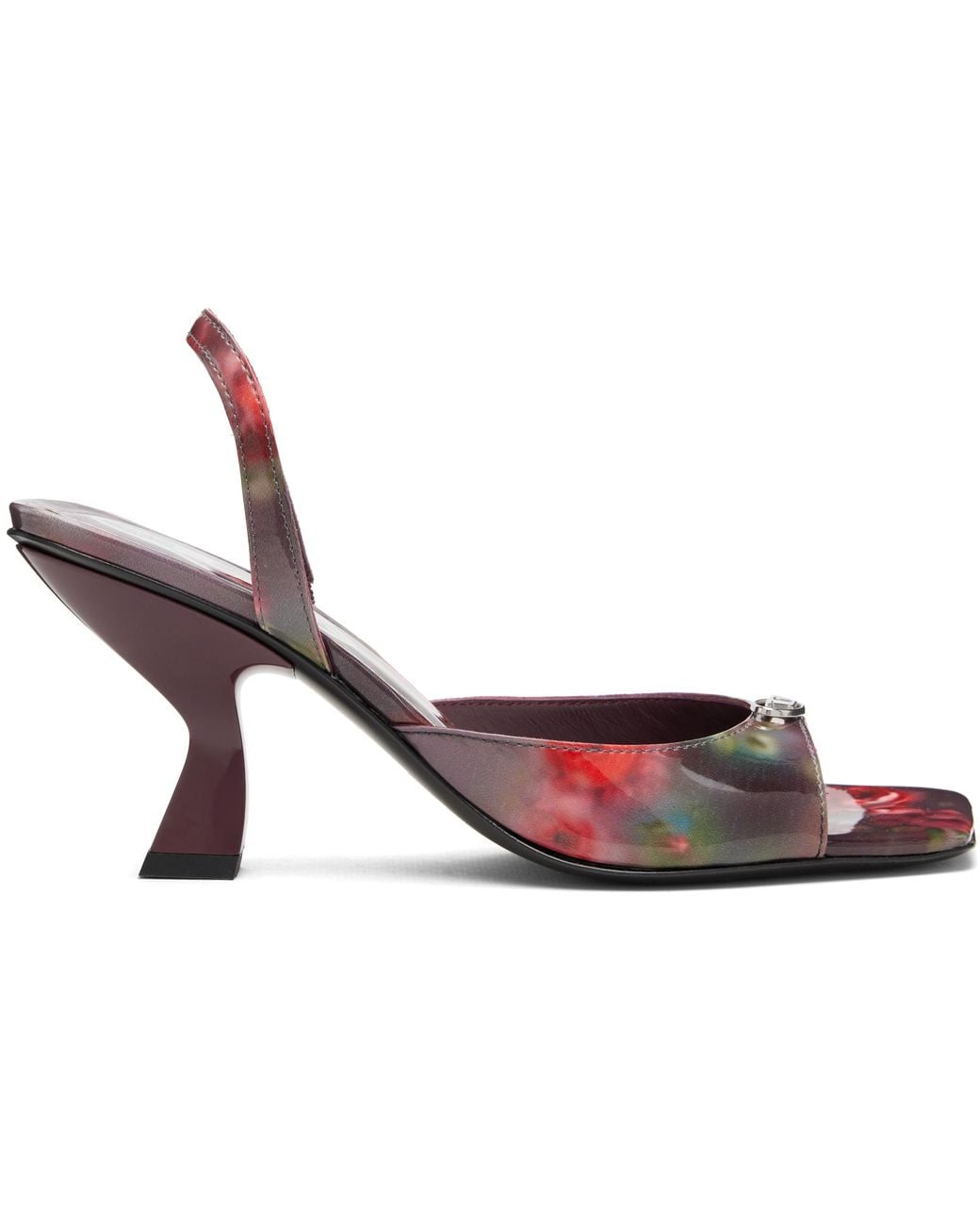 Patent leather heeled sandals. · Floral pattern printed throughout · Square open toe · Logo hardware at vamp · Elasticized slingback strap · Logo stamp at padded footbed · Buffed leather lining · Lacquered spool heel with rubber injection · Leather sole · Heel: H3 Supplier color: Purple Colour: black
