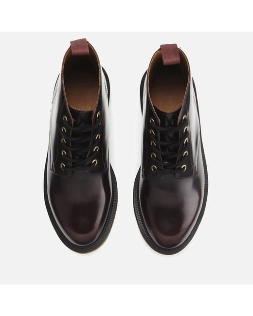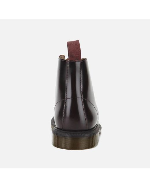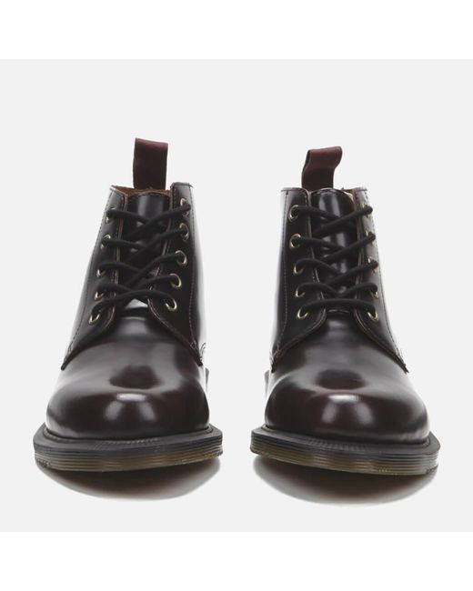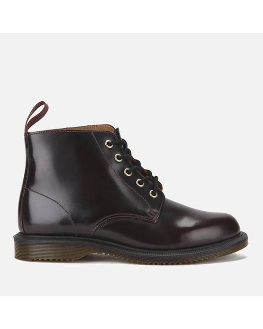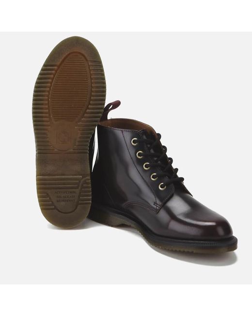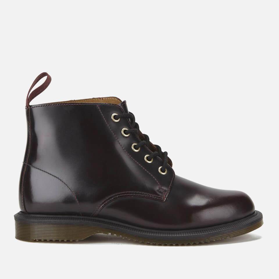 Women's 'Emmeline' Arcadia cherry red leather boots from English subculture purveyors Dr. Martens. Crafted with high-shine dark red leather uppers, the 'Emmeline' boots feature a lace-up fastening with gold-tone metallic eyelets, a rounded toe, and Dr. Martens' signature air cushioned sole which is Goodyear-welted and heat sealed to the upper. Complete with Dr. Martens' 'Air Wair' woven brand tab to the heel. L.R. Upper: Leather. Sole: PVC.