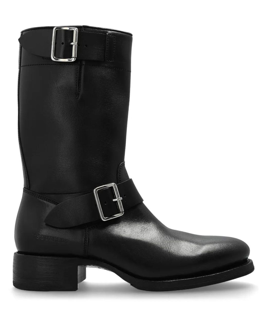 Black leather silver-tone hardware round toe side zip fastening double buckle fastening adjustable side straps block heel rubber sole Size: 45. Gender: Male. Material:Calf Leather/Calf Leather/Leather/Rubber.