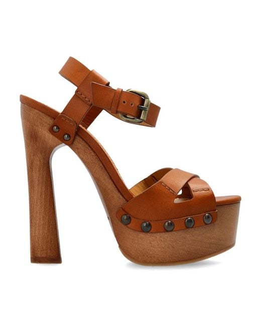Dsquared 2 Platform Sandals blend an avant-garde high block heel with a robust platform in warm brown leather, delivering a bold yet stable designer statement. Refined details—interlacing toe straps, an old gold‑tone buckle and decorative studs—define the silhouette. Key attributes: Brown | Leather | Adjustable ankle strap with buckle | Stable block heel for added wearing comfort | High block heel merging into a seamless platform silhouette | Interlacing toe straps | Old gold‑tone buckle | Decorative dark studs along the platform | Smooth leather finish | Dimensions & fit: Platform height: 6 cm | Heel height: 16 cm | Composition & care: Leather Colour: brown