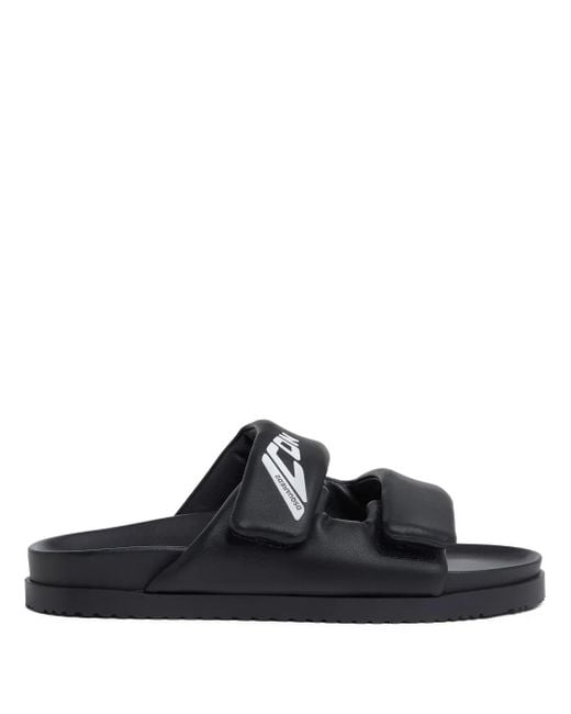 Black faux leather front double touch-strap fastening logo print to the side round open toe moulded footbed branded footbed flat sole Size: 39. Gender: Male. Material:Polyester/Polyurethane/Polyurethane. Colour: black
