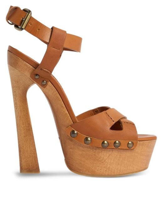 Brown platform sole studded detailing buckle-fastening ankle strap wooden heel crossover straps Size: 35. Gender: Female. Material:Calf Leather/Calf Leather/Rubber. Colour: brown