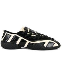 Go to SSENSELow-top canvas and suede trainers in white and grey. · Lace-up closure · Serrated edge detailing at vamp · Logo patch at padded tongue · Padded collar · Buffed faux-leather appliqués embroidered at