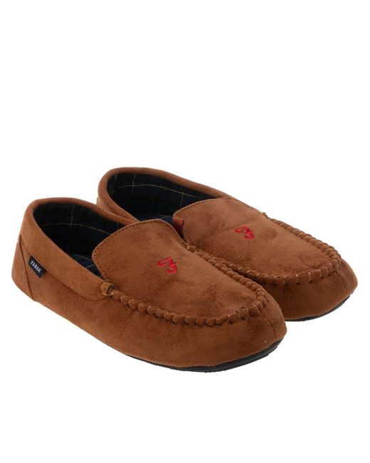Mens Farah Nicken Moccasin Slippers in tan. * Faux suede upper. * Slip on. * Embroidered branding. * Cosy fabric lining. * Cushioned footbed. * Textile upper and lining Synthetic sole. * Ref: FNICKENA Colour: brown