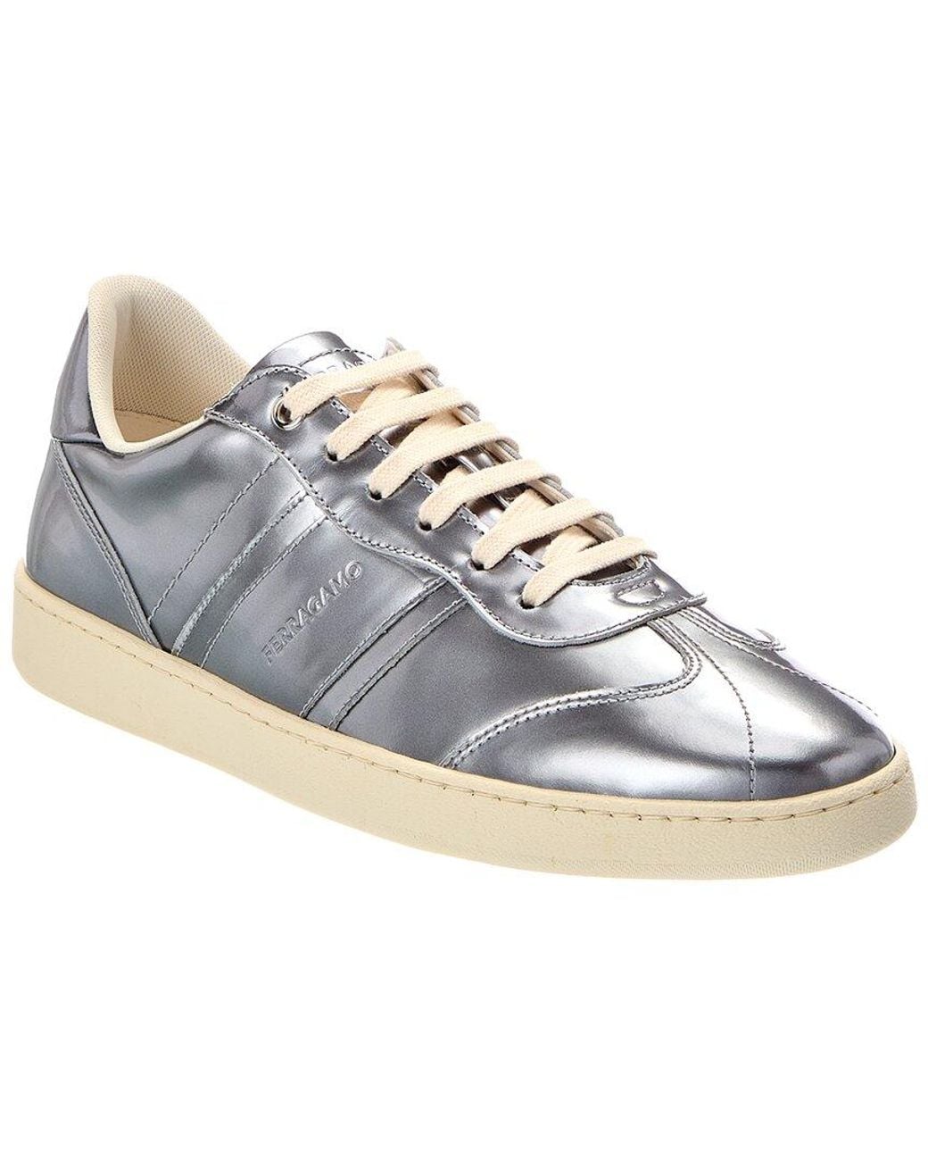 About the brand: The Gancini, The Vara, and all the icons in-between. Made in Italy Achille Patent Sneaker in silver patent leather Lace-up closure Lightly padded leather insole Rubber sole with traction 1in heel 0.75in platform Please note: All measurements are approximate and were taken from a size 9.5; slight variations may occur. Our products are 100% genuine. In some cases we purchase merchandise from trusted independent suppliers and not directly from the brand owner. In all cases we stand by the authenticity of every product sold on our site.