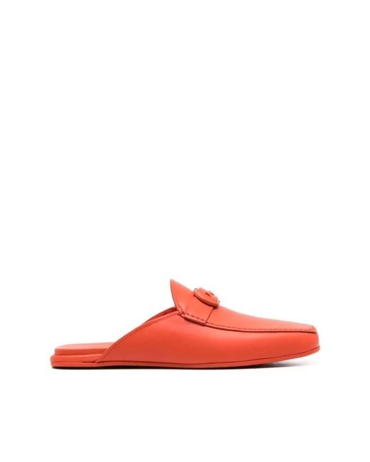 Logo buckle backless slippers from Salvatore Ferragamo featuring carrot orange, leather, matte finish, square toe, tonal stitching, branded insole, slip-on style and flat rubber sole. US Shoe Size - 7Shoe Colour - ORANGEShoe Material - 100%Calfmsrp - 830 Colour: red