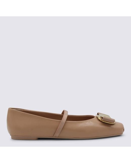 Beige leather flats from Ferragamo featuring square toe, frontal gold patch, upper strap, flip on style and leather sole.Composition: _cover, 100% Le Sole, 100% Le