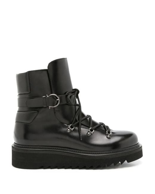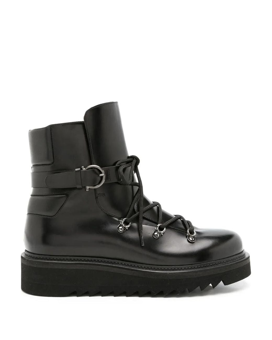 Black calf leather silver-tone hardware lace-up detailing ankle-length round toe Gancini buckle fastening side zip fastening rubber lug sole Size: 5. Gender: Male. Material:Calf Leather. Colour: black