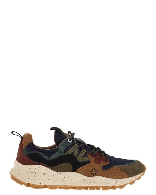 Inspired by the sporty, outdoor world, the Yamano trainers mix active details with a cool aesthetic that is also perfect for the city. The technical fabric upper features suede details with the characteristic overlapping construction, trekking laces and a floral shaped eyelet. The sole is made of ultra-light rubber, with a coloured spoiler under the heel and notched tread. The antibacterial natural cork insole ensures foot well-being and all-day comfort. - Cork insole - Lace-up closure - Ultralight rubber DESIGNER ID: 201781801 2B32