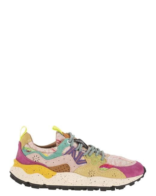 Inspired by the sporty, outdoor world, the Yamano trainers mix active details with a cool aesthetic that is also perfect for the city. The technical fabric upper features suede details with the characteristic overlapping construction, trekking laces and a floral shaped eyelet. The sole is made of ultra-light rubber, with a coloured spoiler under the heel and notched tread. The antibacterial natural cork insole ensures foot well-being and all-day comfort. - Cork insole - Lace-up closure - Ultralight rubber DESIGNER ID: 201781746 1L15