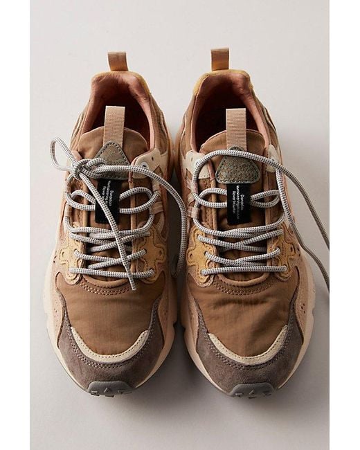 Layers of eye-catching, high-quality materials intertwine to form these ready-for-anything trainers from Flower Mountain, featuring their signature detailing and design elements that keep any and every adventure top of mind. **Features:** Low-boot construction, ripstop fabric upper, technical nylon on the toe, multicolour suede inserts, flower-shaped perforations, reinforcements in the eyelets, trekking laces, EVA sole, contoured edge, indented tread, anti-bacterial treatment **Why We ❤ It:** Th Colour: brown