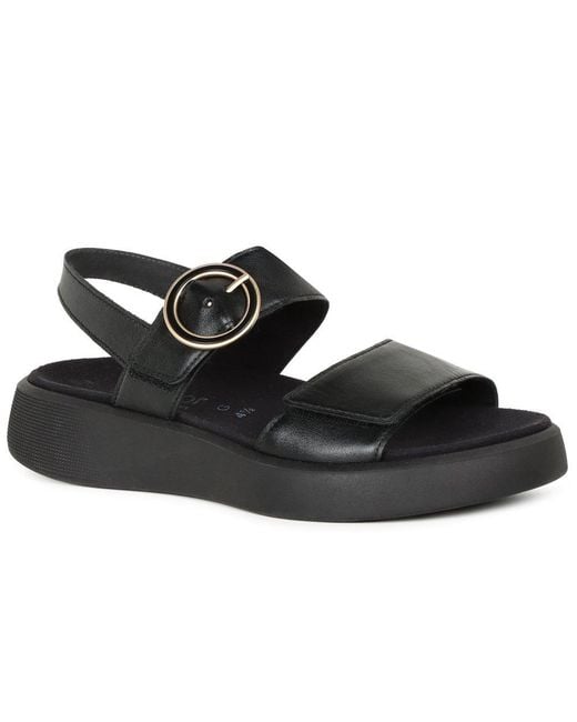 Introducing the Pack sandal which combines a modern silhouette with classic styling and a chic O-buckle detail. This sandal packs a punch with its removable insole and comfy rip tape fastening hidden by a chic O-shaped buckle detail. With its smooth platform sole, the Pack will be a perfect addition to your summer wardrobe. Uppers: Leather Lining: Microfibre Sole: Thermoplastic rubber Width Fit: UK C+ (Gabor F) Heel Height: 4cm Fastening: Rip tape Product Code: 62.863 Colour: black