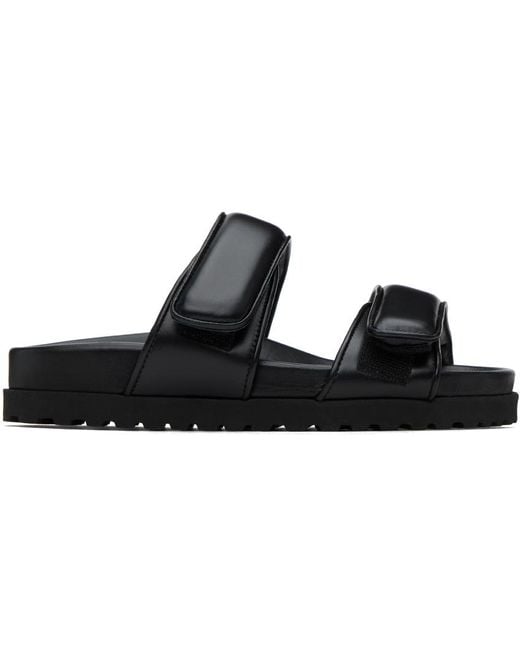Buffed leather slip-on sandals in black. · Open round toe · Adjustable padded velcro straps at vamp · Molded grained leather footbed · Treaded rubber sole Supplier color: Black