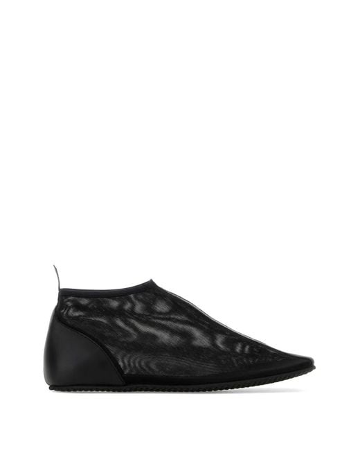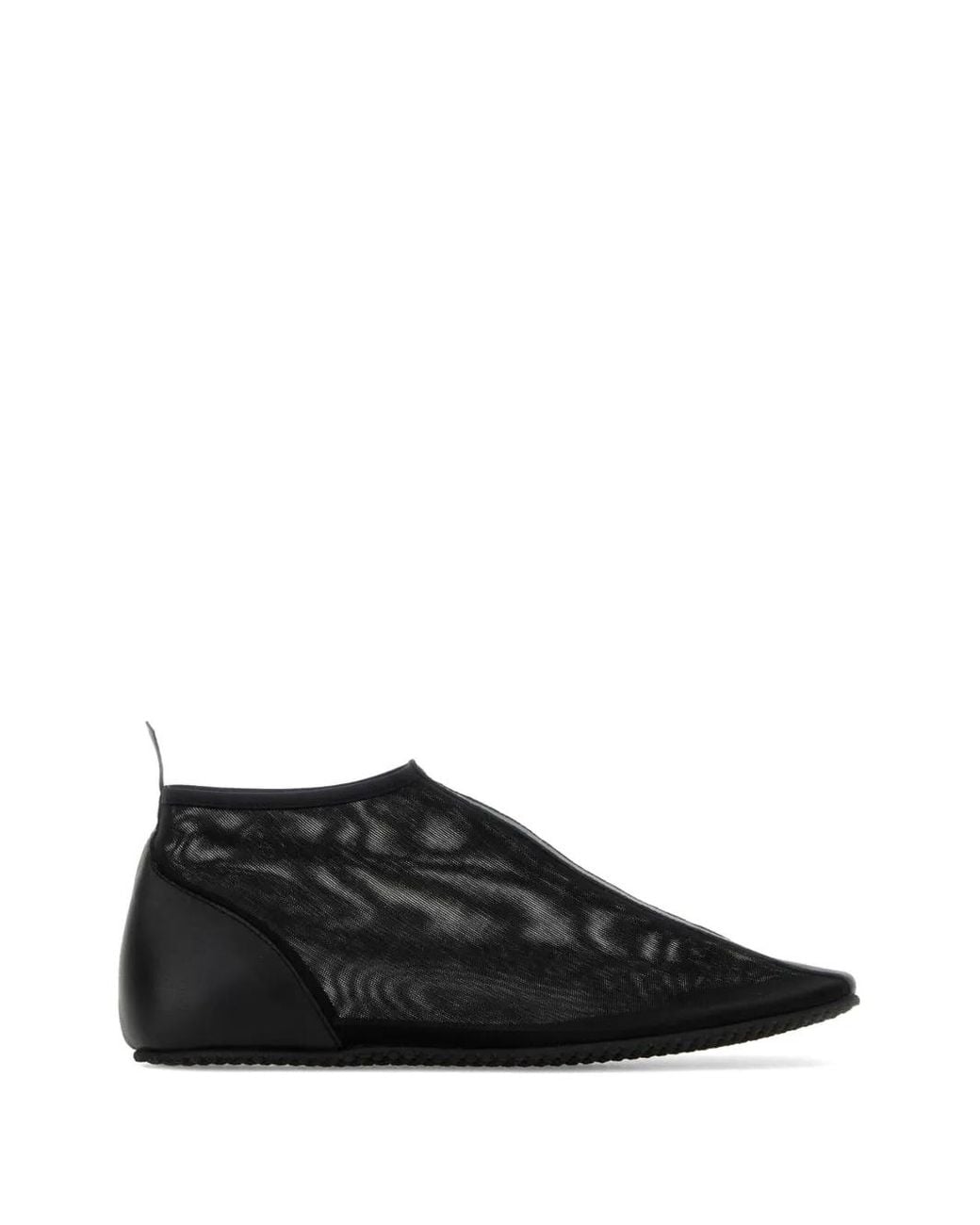 Black mesh panels pull-tab at the heel slip-on style round-toe flat rubber sole ankle length Size: 36. Gender: Female. Material:Mesh/Calf Leather/CALFSKIN/Rubber. Colour: black