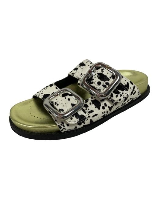 Gioseppo Mifflin Pantolette pairs two adjustable straps with gold-tone buckles and a padded, ergonomically pre-formed leather insole for comfortable everyday wear. The textured, lightweight EVA sole adds durable traction for casual use. Key attributes: Green | Kuh | Leather | Textured, lightweight EVA sole | Two adjustable straps with gold-tone buckles | Padded, ergonomically shaped leather insole | Animal print | Two-strap slider design | Gold-tone hardware | Composition & care: Leather | EVA Colour: black