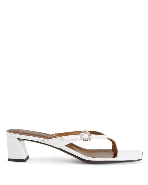 <ul><li>Off-white patent leather</li><li>Silver-coloured metal buckle with crystal-coloured rhinestones</li><li>45 mm-high heel.</li><li>Brown leather sole with logo</li></ul>