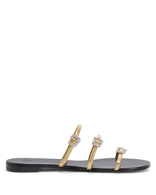 <ul><li>Laminated golden leather</li><li>Silver-coloured metal buckles with crystal-coloured rhinestones</li><li>10 mm-high heel.</li><li>Glossy black leather sole with logo</li></ul>