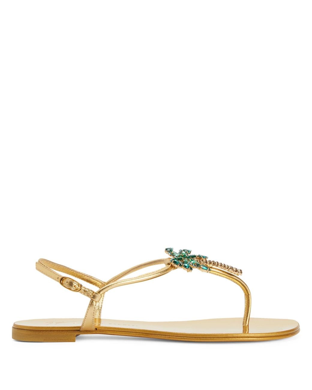 <ul><li>Laminated golden leather</li><li>Golden metal palm accessory with green and topaz rhinestones</li><li>Adjustable ankle strap with golden metal buckle</li><li>10 mm heel</li><li>Golden laminated leather sole with logo</li><li>Made in Italy</li></ul>